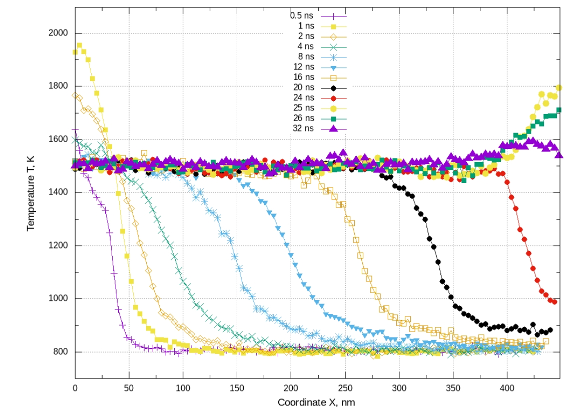 Как видно из рисунка 6, скорость движения фронта волны горения (отношение перемещения фронта ко времени этого перемещения) по ходу распространения волны изменяется (увеличивается). Т.е., определяя расстояние и время перемещения между «соседними» профилями, их отношение (скорость фронта) увеличивается приблизительно от 13 м/c (в пределах первых 12 нс) и до 22 м/c (от 12 до 24 нс). Т. о., можно сделать вывод, что наблюдается режим «разгона» волны горения. В конечной зоне СБС (координата Х в диапазоне 400-420 нм) с течением времени температура медленно повышается (не остается начальной 800 К), поэтому в конечной стадии распространения волны горения происходит «зажигание» СВС в этой конечной зоне СБС без дополнительного внешнего источника нагрева.