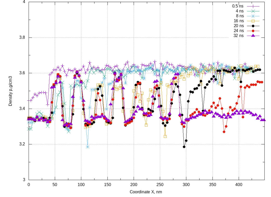 К 25 нс волна горения достигает конечной зоны СБС и на последнем профиле плотности (маркеры 32 нс, рис. 7) наблюдаются пять «пиков» плотности, соответствующих расположению гетерофазных структур на рисунке 5. Отметим тот факт, что «эффективная» ширина пиков плотности (порядка 25 нм) практически совпадает с шириной гетерофазных интерметаллидных структур (согласно рисунку 5), т. е. согласуются результаты относительно гетерофазных структур, полученные двумя разными методами (визуализация OVITO и профили плотности).