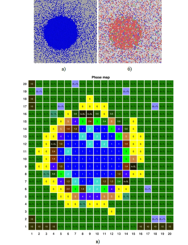В качестве результатов распознавания пространственного 3D-распределения синтезированных интерметаллидных прослоек на границе раздела наночастиц со структурой Тi-Al «ядро-оболочка» на рисунке 8 (фрагмент в) отражена одна 2D-карта распределения фаз из 20 карт (соответствующих 20-и вертикальным слоям-сечениям по 400 кубиков), составляющих вместе общее 3D-распределение интерметаллидных прослоек в кубической наночастице со структурой Тi@Al «ядро-оболочка». Отраженный на рисунке 8 (фрагмент в) слой с номером NX=17 расположен практически близко к конечному 20-у слою, до которого доходит волна горения приблизительно при завершении 1-ой наносекунды, но процесс фазо- и структурообразования продолжается и далее (и за пределами 2 нс).