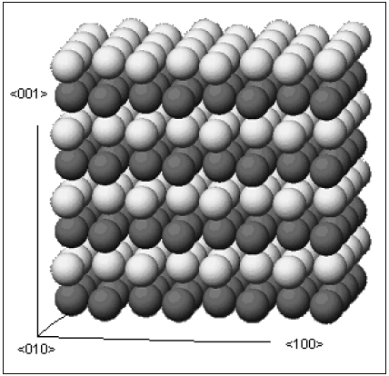 Рисунок 2 – Модель упорядоченного сплава состава CuAu I, соответствующего сверхструктуре L10. Темным цветом обозначены атомы Cu, светлым цветом – атомы Au