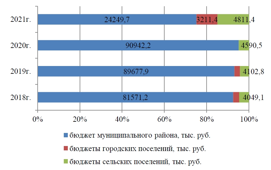 В 2021 г. темп роста показателя расходов муниципального бюджета, направляемых на реализацию муниципальной программы «Развитие транспортной системы», составил 55 % (рисунок 1). Также значительно снизился показатель удельного веса «транспортных» расходов в совокупном бюджете района: если на протяжении 2018–2020 гг. он составлял порядка 2,5 %, то в 2021 г. уже 1,2 %.