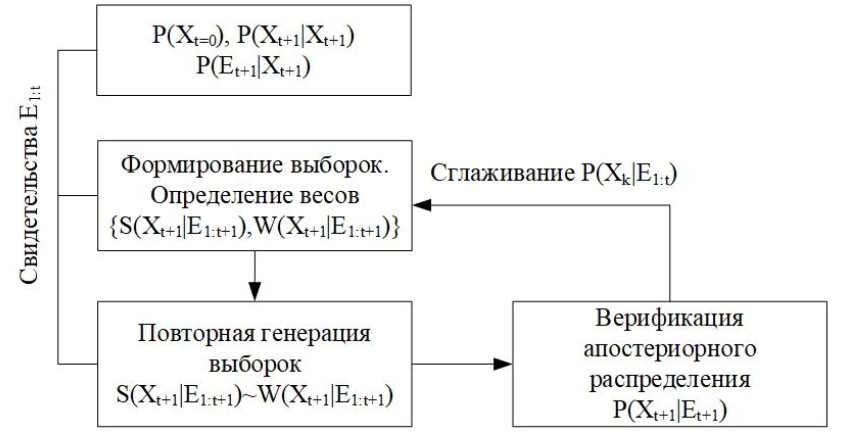 Существует несколько основных подходов к решению задач логического вывода на основе МЧФ. Наибольший интересе представляют МЧФ на основе выборки по значимости (ВЗ) и взвешивания на основе правдоподобия (ВП). В данном исследовании рассмотрим МЧФ с взвешиванием на основе правдоподобия. Данный алгоритм позволяет изначально производить генерацию только из области выборок , которые в наибольшей степени согласуются со свидетельствами . Такое условие достигается за счет того, что в процессе выполнения вероятностного вывода на основе ВП происходит определение и фиксирование переменных свидетельств , а формирование выборок осуществляется исключительно для всех оставшихся переменных , где переменные запроса и переменные состояния. В процессе выполнения алгоритма производится развертывания динамической модели и происходит формирования выборок , которые взвешиваются с учетом их правдоподобия на основе анализа полученных весов . Веса выборок рассчитываются на основе переходных вероятностей и условного распределения по всем свидетельствам . Типовая схема фильтра МЧФ с ВП приведена на рис. 2.