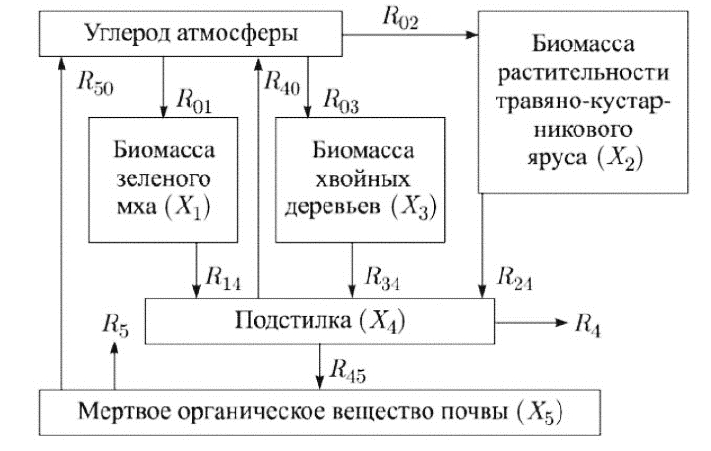 В работе [12] описываются свойства класса математических моделей экологических систем, строящихся по известным в математической экологии диаграммам «запасы–потоки». Алгоритм конструирования таких динамических моделей был предложен Моисеевым и Свирежевым [13]. Выясняются условия диссипативности систем обыкновенных дифференциальных уравнений, инвариантности конуса неотрицательных векторов фазового пространства и формы матрицы Якоби для равновесия. Приводятся примеры вычислительных экспериментов с моделями конкретной болотной экосистемы. На рисунке 3 представлена схема экологической модели, где все запасы измерены в г/м2, а потоки в г/(м2⋅год) сухого веса, т.е. в массовых, а не углеродных единицах.
