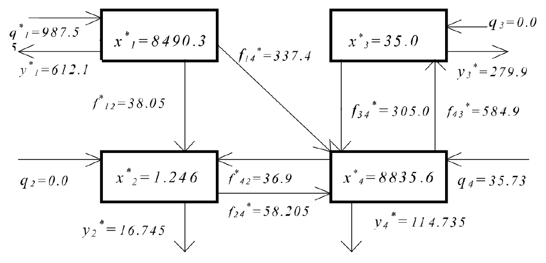 Запасы: x1 − растения, x2 − животные, x3 − грибы и бактерии, x4 − отмершие части за исключением торфа (в единицах г/м2). Входные потоки: q1 − ассимиляция и фотосинтез, q4 − поступление с осадками и из других систем. Выходные потоки: y1 − дыхание растений и потребление фитофагами из других систем, y2 − дыхание животных, y3 − дыхание грибов и бактерий, y4 − вынос со стоком, торфообразование, абиотическое окисление (в единицах г/(м2 год)).