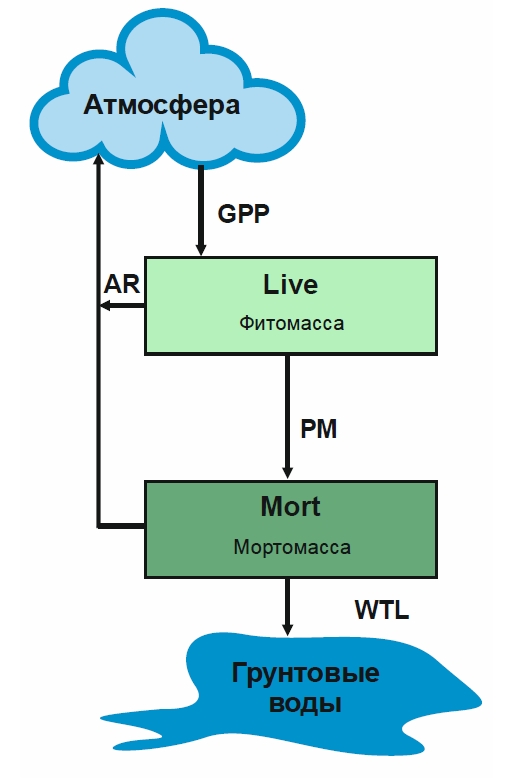 В работе [2] предложена математическая модель углеродного цикла в болотных экосистемах, представленная в виде двух взаимодействующих пулов органического углерода: