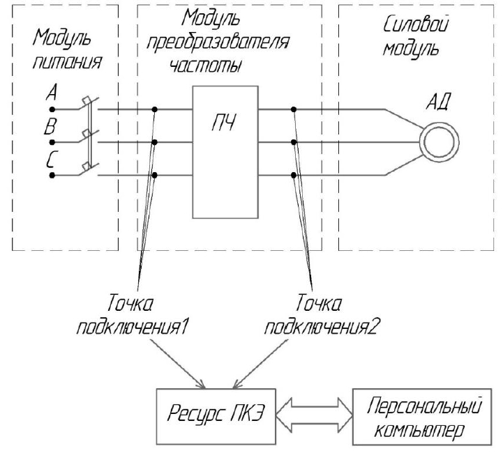 Исследования проводились на лабораторном стенде (рис. 1), содержащем модуль питания, модуль преобразователя частоты, служащий для управления асинхронным трёхфазным двигателем с короткозамкнутым ротором и силовой модуль, содержащий асинхронный двигатель с короткозамкнутым ротором. Схема исследования приведена на рисунке 2.