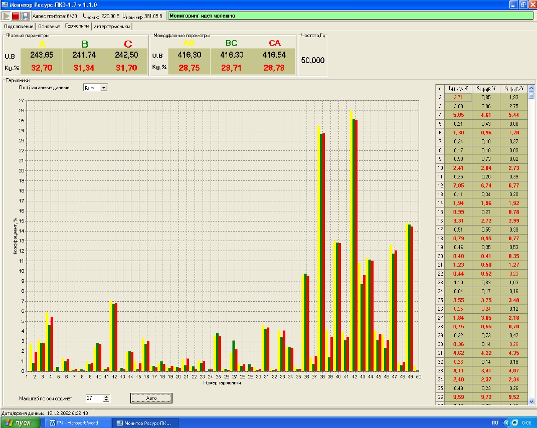 № гармоники | Значение KU(n) на фазе А, % | Значение KU(n) на фазе В, % | Значение KU(n) на фазе С, % |