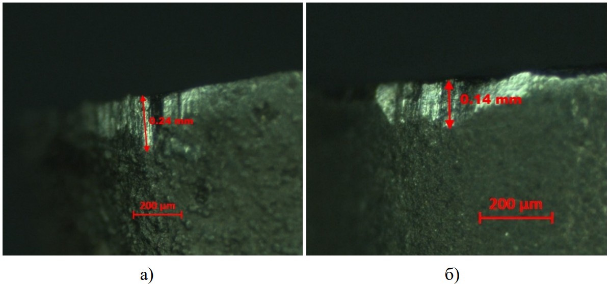 Рисунок 2 – Фаска износа задних поверхностей после 4 км. точения: (a) исходная пластина КНТ16, (б) после обработки НПИ N++Ti+ (б).