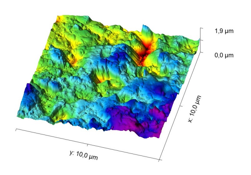 Исследование изменения морфологии поверхности проводилось с использованием метода атомно-силовой микроскопии (АСМ) на сканирующем зондовом микроскопе Ntegra prima. На рисунке 3 представлены АСМ- изображения поверхности исходного твердого сплава. Среднее значение шероховатости поверхности Sa, измеренное по полю 10 мкм2. составило 234,9 нм. Номинальная площадь поверхности 129,8 мкм2. На всей поверхности наблюдается наличие большого количества равномерно распределенных макрозёрен (TiCN) диаметр которых составляет ~ 0,5-1 мкм, а их усредненная высота выступа относительно поверхности составляла ~ 0,3-0,4 мкм.
