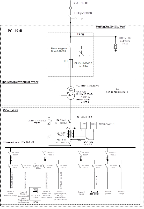 Типовая схема комплектной трансформаторной подстанции (КТП) с резервированием от ДГУ (ДЭС 200 кВт, фидер 7) представлена на рис. 1. Мощность силового понижающего трансформатора составляет 400 кВ·А.