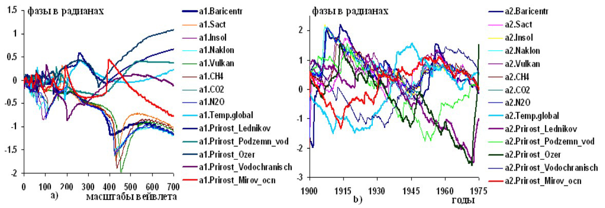 Рисунок 1 – Графики вейвлетных: a) и b) фазо-частотных и фазо-временных характеристик гелиокосмических (Baricentr, Sact, Insol, Naklon, Vulkan, , климатической переменной (Temp.global) и тенденций приращений запасов водных масс: ледников, подземных вод, озер, водохранилищ и Мирового океана по наблюдениям в 1900-1975 годы