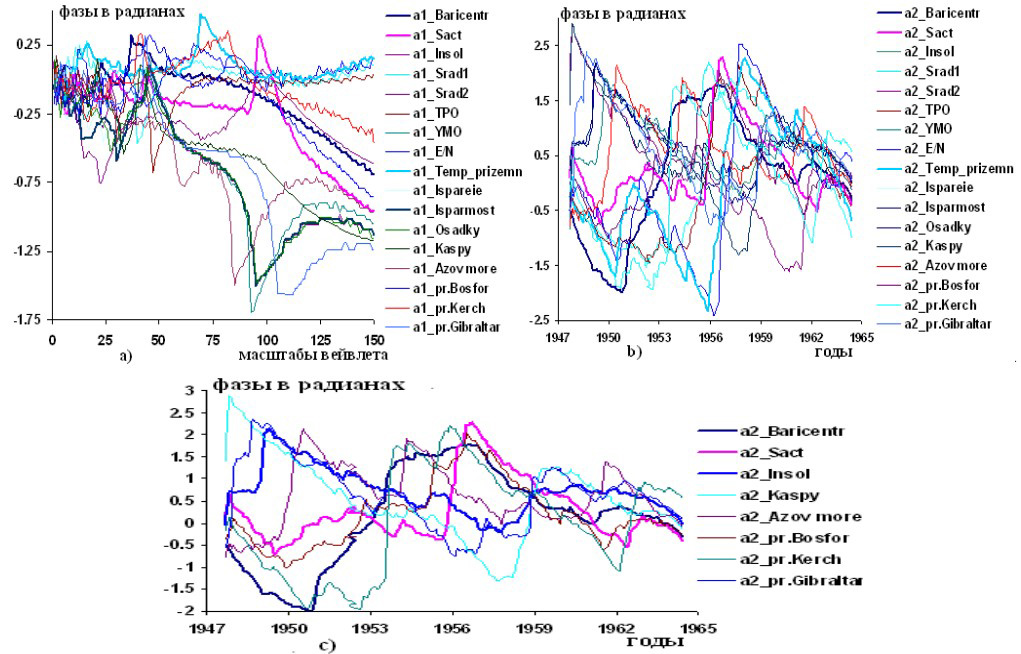 Рисунок 2 – Графики изменений вейвлетных: a) и b) фазо-частотных и фазо-временных характеристик групп взаимодействующих факторов и переменных: гелиокосмических (Baricentr, Sact, Insol), климатических (Srad1, Srad2, , Temp.prizemn), тепловых и водных ресурсов на суше (Isparene, Isparayemost, Osadky), cоставляющих водного баланса южных морей Европы (Kaspy, Azov.more, pr.Bosfor, pr.Kerch, pr.Gibraltar); с) вейвлетных фазо-временных характеристик гелиокосмических переменных и cоставляющих водного баланса южных морей Европы по наблюдениям в 1947,7-1964,4 годы