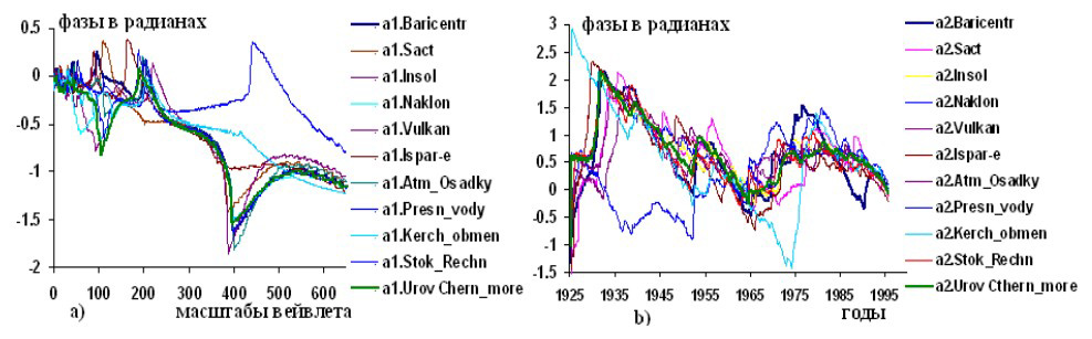 Рисунок 3 – Графики изменений вейвлетных: a) и b) фазо-частотных и фазо-временных характеристик гелиокосмических (Baricentr, Sact, Insol, Naklon, Vulkan), климатических переменных (Isparenie, Atm.osadky) и составляющих водного баланса и уровня Черного моря: Presn.vody, Kerch.obmen, Stok.rechn, Urov.Сhern.more по наблюдениям в 1925,2-1995,7 годы