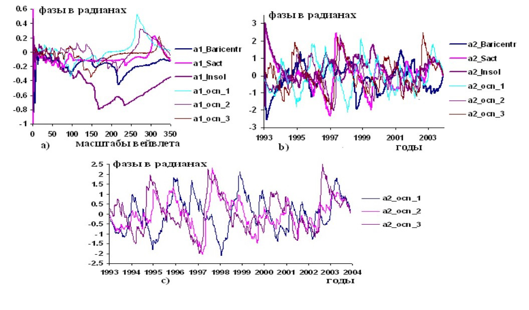Рисунок 4 – Графики изменений вейвлетных: a) и b) фазо-временных и фазо-частотных характеристик гелиокосмических (Baricentr, Sact, Insol) и уровней океанов: Индийского, Западного и Центрального Тихого (ocn_1), Восточного Тихого и Атлантического (ocn_2), Мирового (ocn_3); c) фазо-временныx характеристики океанов: ocn_1, ocn_2, ocn_3 по наблюдениям в 1993-2003,9 гг.