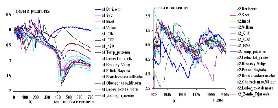 Рисунок 5 – Графики изменений вейвлетных: a) и b) фазо-частотных и фазо-временных характеристик гелиокосмических (Baricentr, Sact, Insol, Vulkan, ), климатической приземной температуры (Тemp.prizemn) и составляющих водного баланса: ледовитостей Татарского пролива (Ledov Tat.proliv) и Охотского моря (Ledov oxotsk more), ресурсов Волги (Resursy Volgy), притоков Байкала (Pritok Baykala), уровня Братского водохранилища (Bratsk vodoxranilische), обобщенного уровня Мирового океана (Obobch urov.Mir.ocn) по наблюдениям за переменными в 1930,2-2005,4 гг.