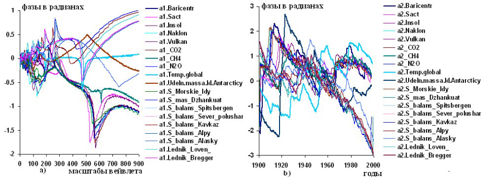 Рисунок 7 – Графики изменений вейвлетных: a) и b) фазо-частотных и фазо-временных характеристик гелиокосмических переменных (Baricentr, Sact, Insol,Naklon, Vulkan, ) климатической переменной Temp.global и балансов масс льдов в ледниковых районах: удельной массы льдов в Антарктике (Udeln.mass.ldov.Antarktiky), суммарного баланса морских льдов в Северном полушарии (S.mass.Sever.polushar), балансов ледников: Джангитау (mass.Dzhankuat), Шпицбергена (balans.Spitsberger), Кавказа (balans.Kavkaz), Альп (balans.Alpy), Аляски (balans.Alasky) Ловена Среднего (Lednik.Loven), Бреггера Восточного (Lednik.Bregger) по наблюдениям в 1900,8-1999,6 гг.