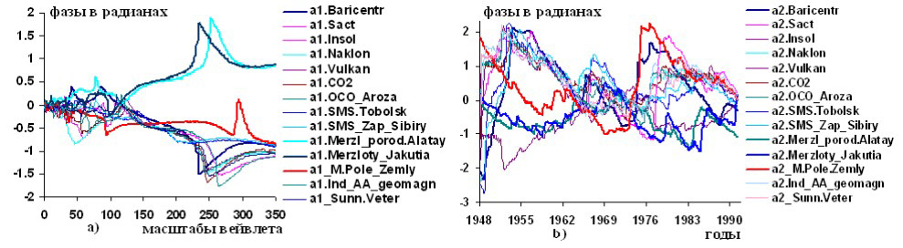 Рисунок 8 – Графики изменений вейвлетных: a) и b) фазо-частотных и фазо-временных характеристик гелиокосмических (Baricentr, Sact, Insol, Naklon, Vulkan, OCO_Aroza) и некоторых составляющих межсезонных оттаиваний грунтов в криолитозонах континента: мощности сезонно-мерзлотного слоя (СМС) на метеостанции Тобольск (SMS.Tobolsk), на 10 метеостанциях Западной Сибири (SMS.Zap.Sibiry), мощности мерзлых толщ в районе перевала Жусалы-кезен, хребта Заилийский Алатау (Merzl.porod.Alatay) и мерзлот в Якутии (Merzloty. Jakutia), магнитного поля Земли (M.pole.Zemly), индекса геомагнитной активности АА (Ind.AA.geomagn), солнечного ветра (Sunn.Veter)