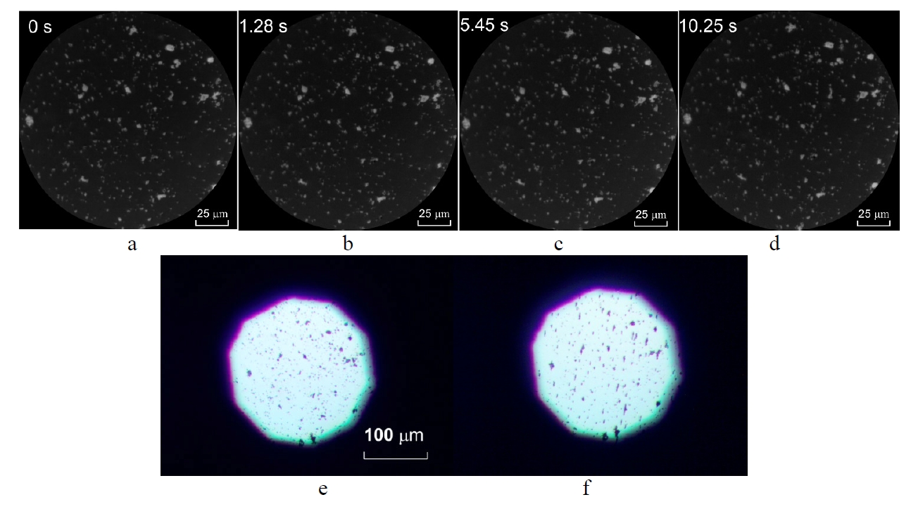 Рисунок 4. Изображение наночастиц магнетита, полученное с помощью видеокамеры ToupCam в оптическом микроскопе Микромед. : (a-d) – динамика броуновского движения наночастиц, (e,f) – моментальное распределение наночастиц (е)- без магнитного поля, (f) – с магнитным полем.