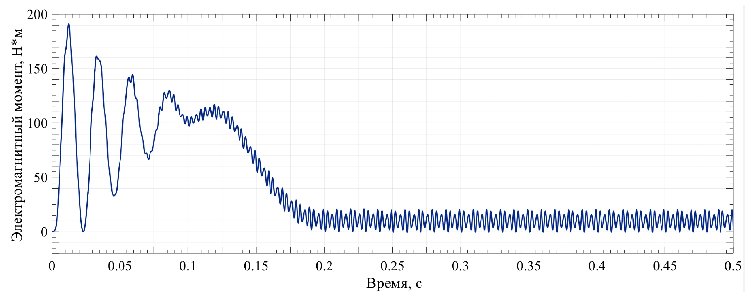 В рамках настоящего исследования был произведен анализ развития переходного процесса при пуске асинхронного двигателя при питании от несинусоидального напряжения (рисунок 3). Результаты имеют качественное совпадение с исследованиями других авторов по данной тематике [12, с. 860].
