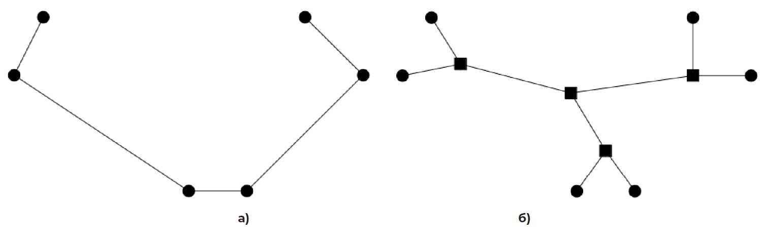 Задача Штейнера формулируется как поиск наименьшего дерева, соединяющего все вершины . Возможны два случая: а) ; б) (рисунок 1). В первом случае задача сводится к поиску минимального остовного дерева для графа , которую можно решить классическими алгоритмами Прима и Краскала. Во втором случае задача отличается от поиска минимального остовного дерева тем, что необходимо выбрать (найти) дополнительные точки в пространстве для минимизации стоимости дерева [6].