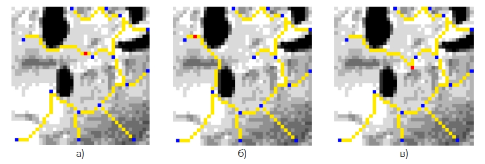 Рисунок 3. Промежуточные результаты поиска точки Штейнера генетическим алгоритмом: а) оптимальный вариант; б) неоптимальный вариант; в) классический подход.