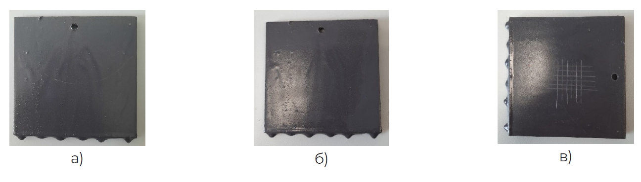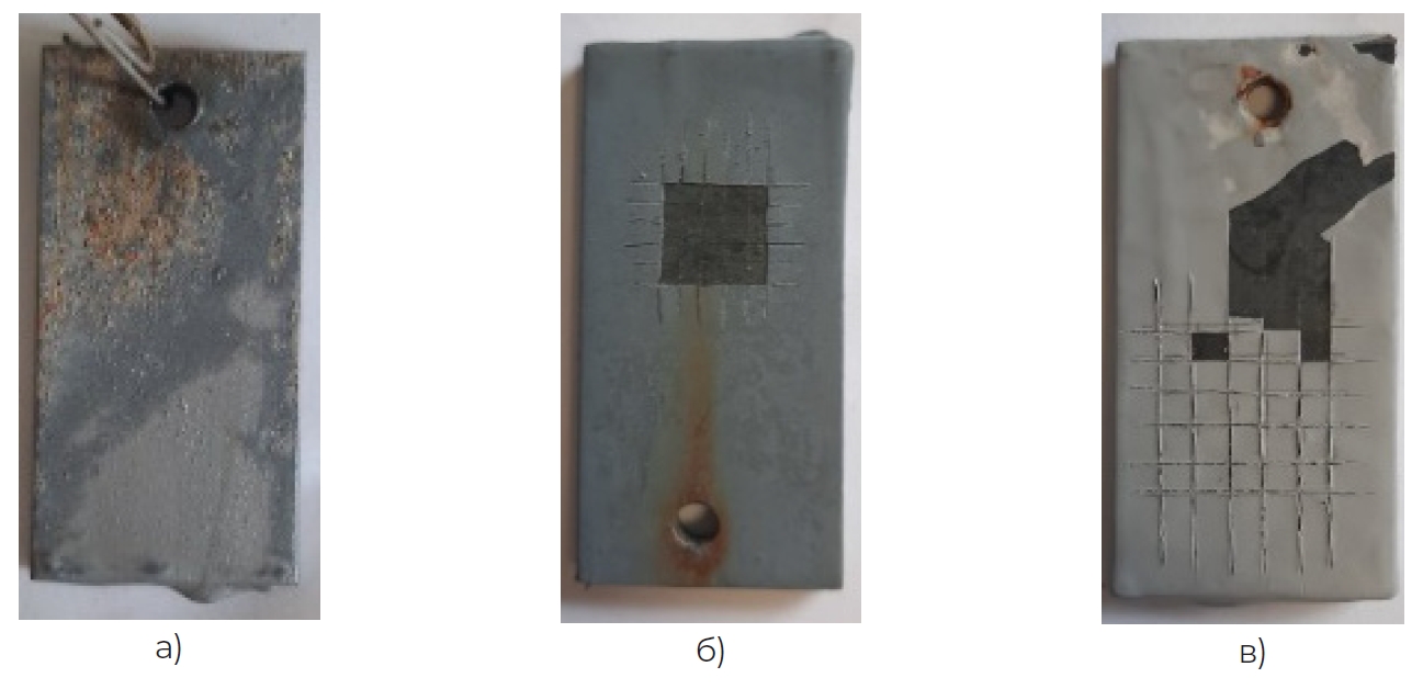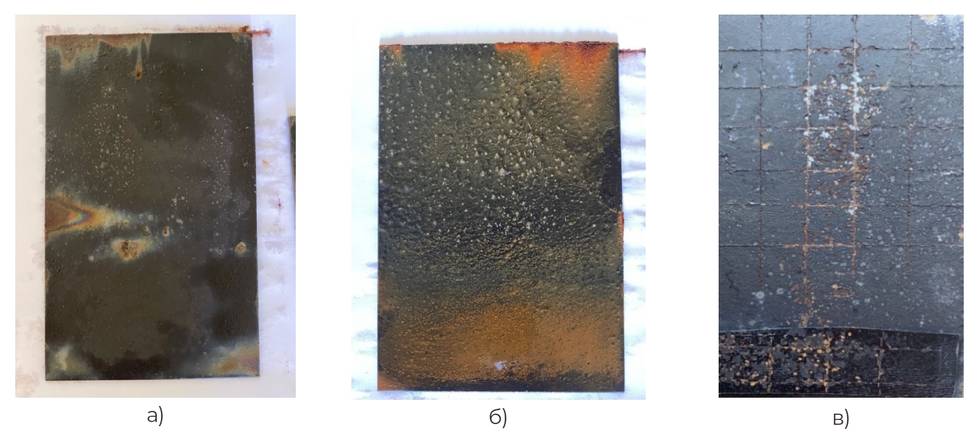 Рисунок 2. Образцы покрытия №1 после выдержи в агрессивной среде: а, б – изменение цвета покрытия и образование продуктов коррозии, в – меление покрытия при определении адгезии методом решетчатых надрезов.