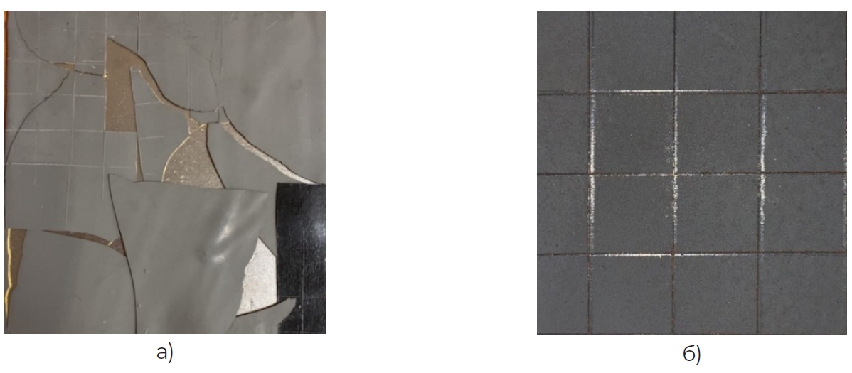 Рисунок 4. Покрытие № 2 и покрытие № 1 после выдержки при отрицательных температурах: а – разрушение эпоксидного покрытия при отрицательных температурах, б – определение адгезионных свойств покрытия № 1 при отрицательных температурах.