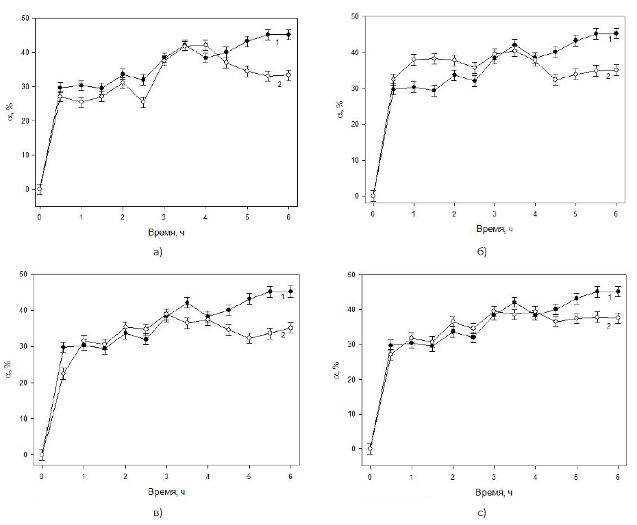 α,% | 44,8±0,5 | 32,9±0,4 | 34,7±0,3 | 34,9±0,7 | 37,3±0,5 |