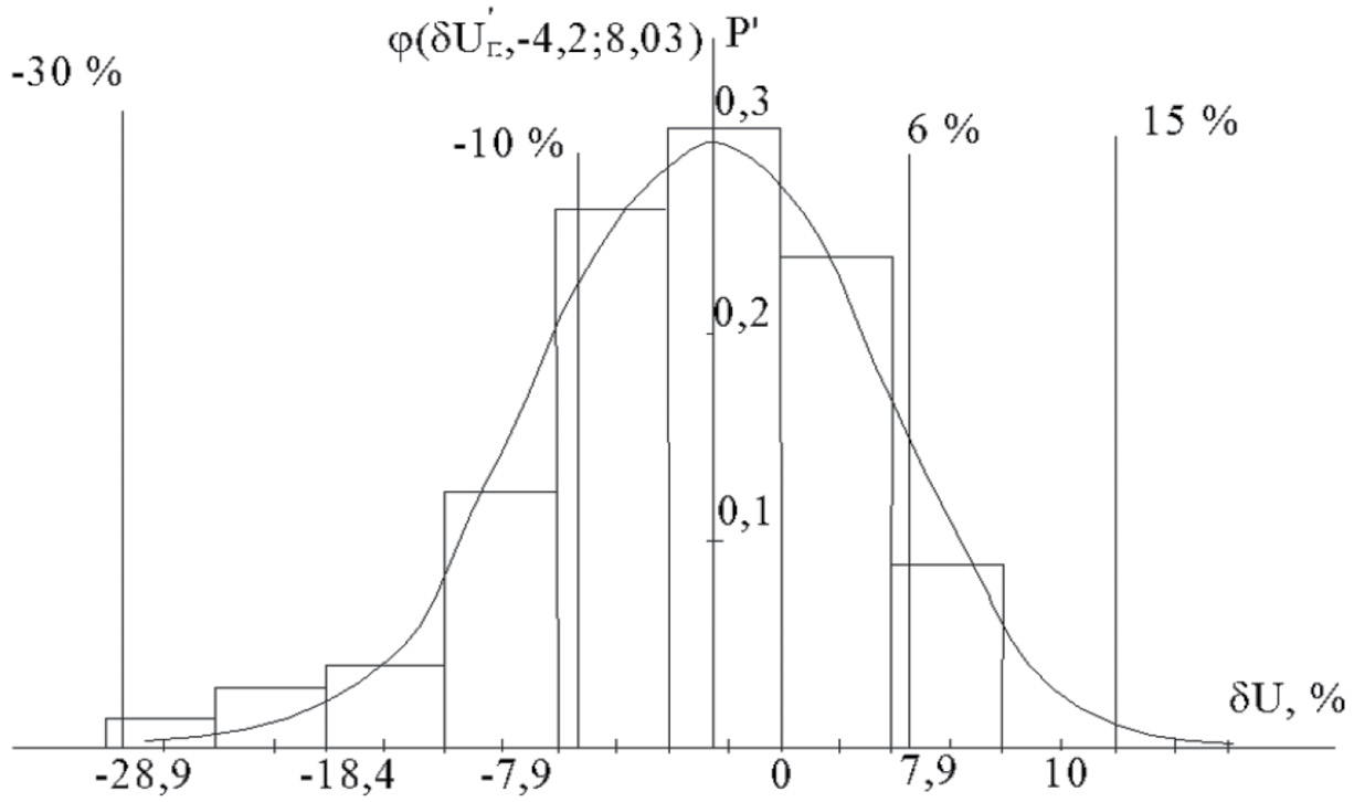 Результаты математической обработки медленных изменений напряжений на шинах 0,4 кВ ГРЩ показали, что требования ПСВП РРР не выполняются. Случайная величина δU следует нормальному закону распределения теории вероятности и математической статистики с параметрами: M[δU] = 4,2 %; σ[δU] = 8,03 %; относительное значение времени превышения длительных допустимых значений медленных изменений напряжений составляет около 20 %, а относительное значение времени превышения кратковременных допустимых значений медленных изменений напряжений около 1 % (рис. 2).