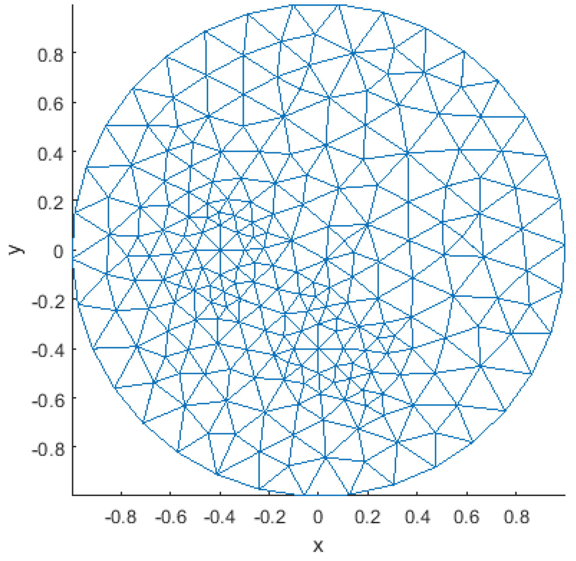Возьмем в качестве области G круг |x|=2, примерная сетка указана на рис. 1. Возьмем Т=5 и рассмотрим однородное условие Дирихле. В качестве коэффициентов a0=(t+1)(x2+1), a1=2/(t2+1), a2=(t+1)(x+1), с1=(t-1)2 с2=2t+1.