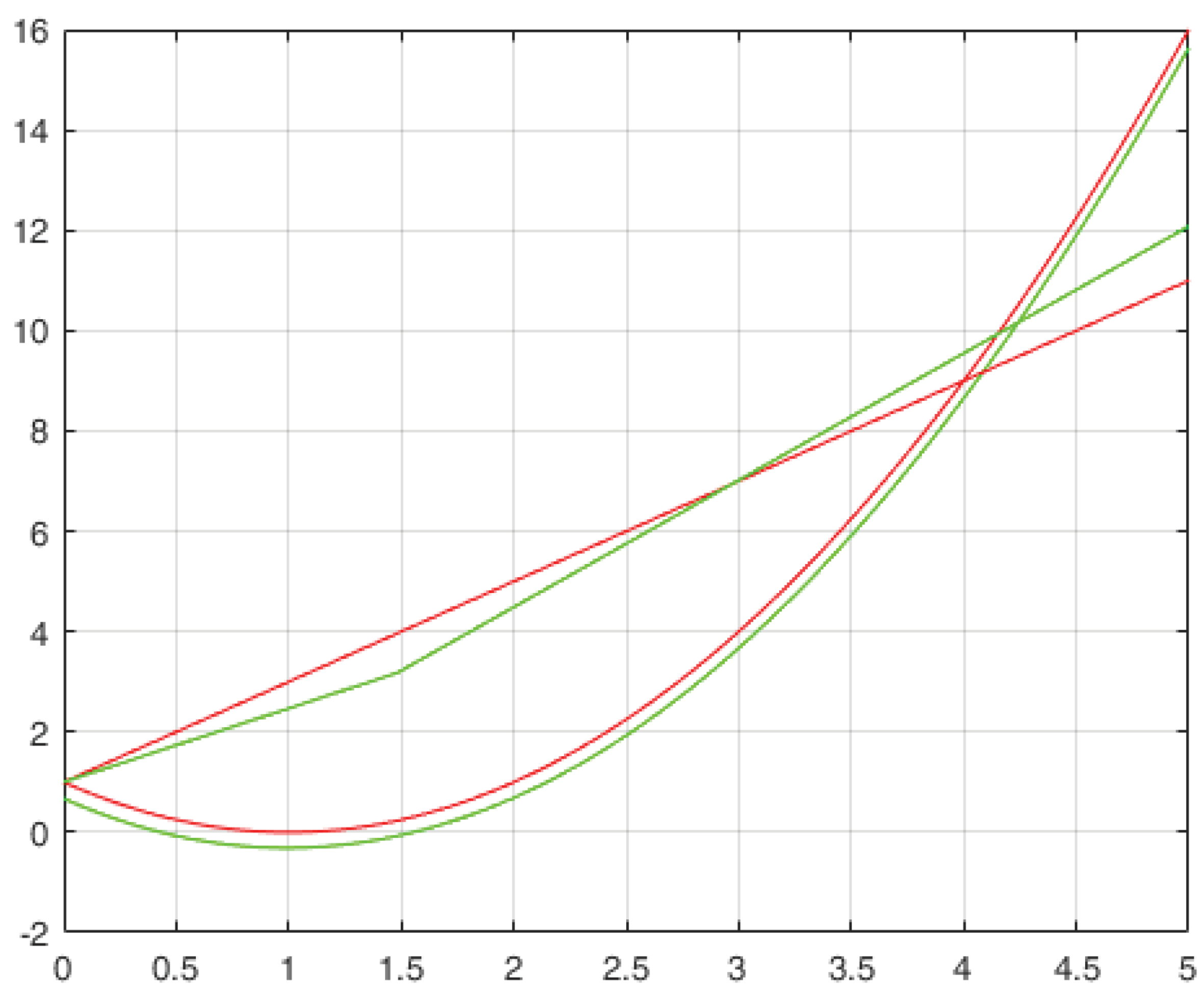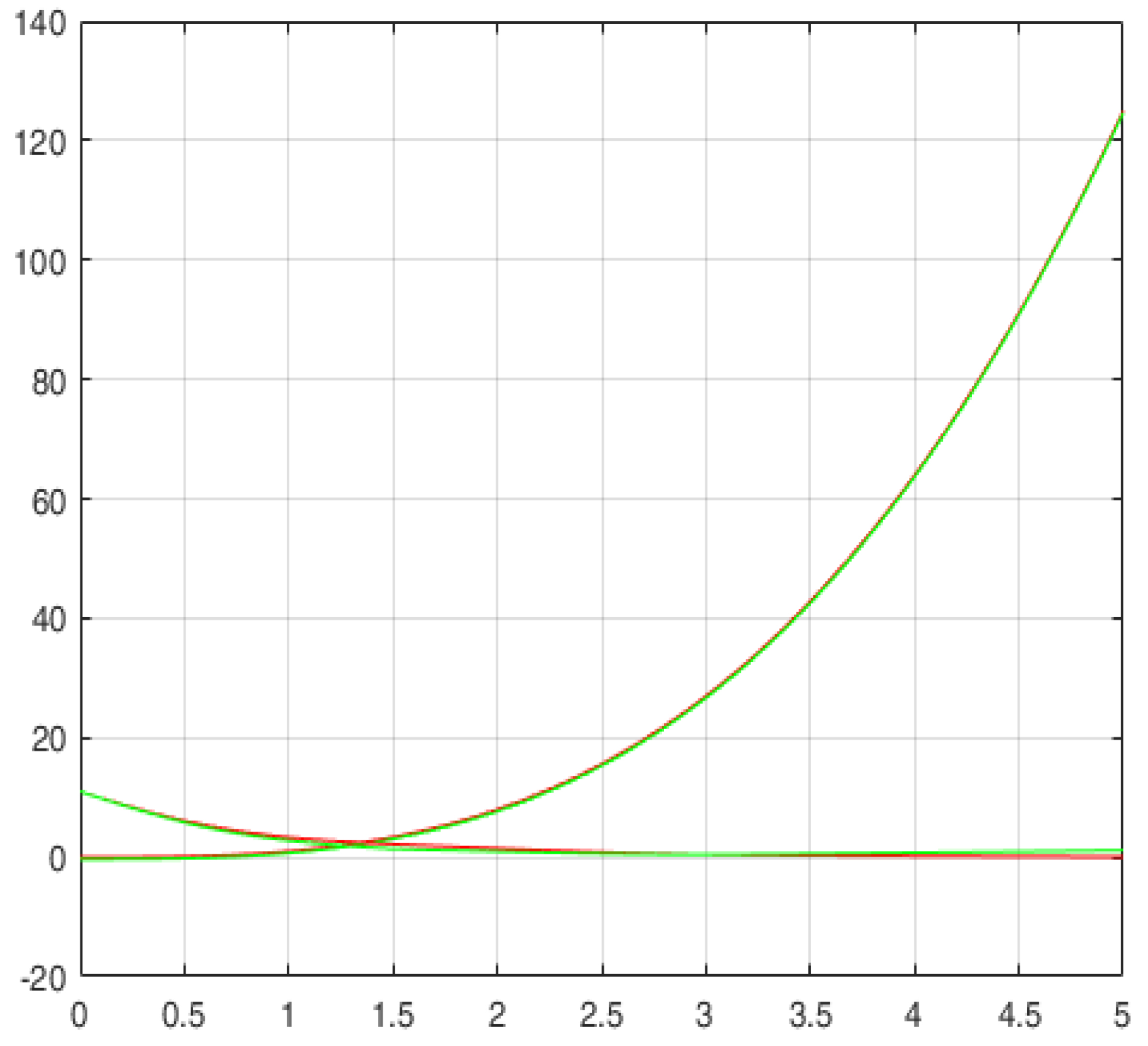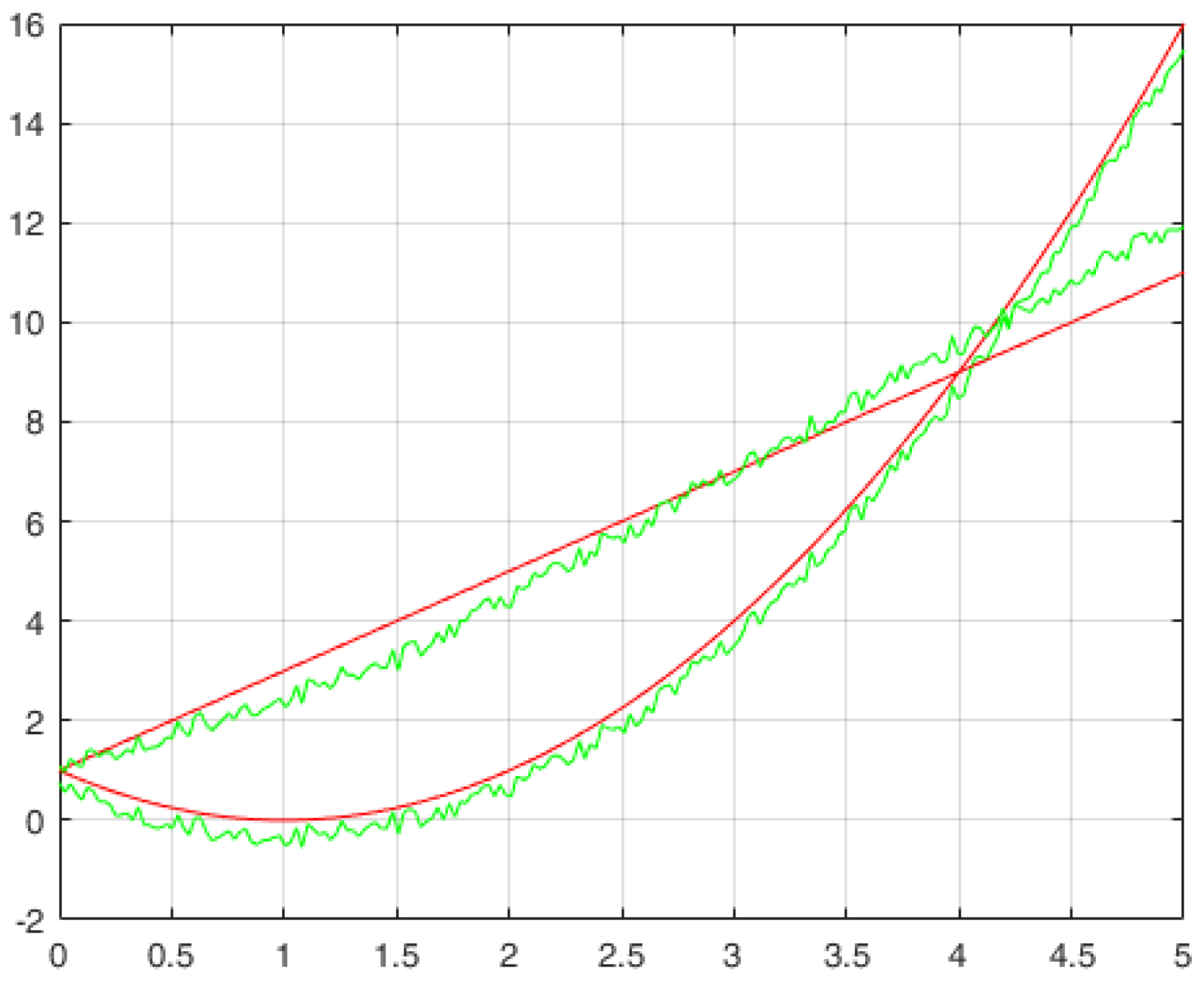 Для повышения точности было решено увеличить точность расчетов и взять значение ε0=10-4. Результат построения представлен на рисунке 5, зеленым обозначены найденные функции, красным – эталонные. Как можно заметить, графики сходятся намного лучше.
