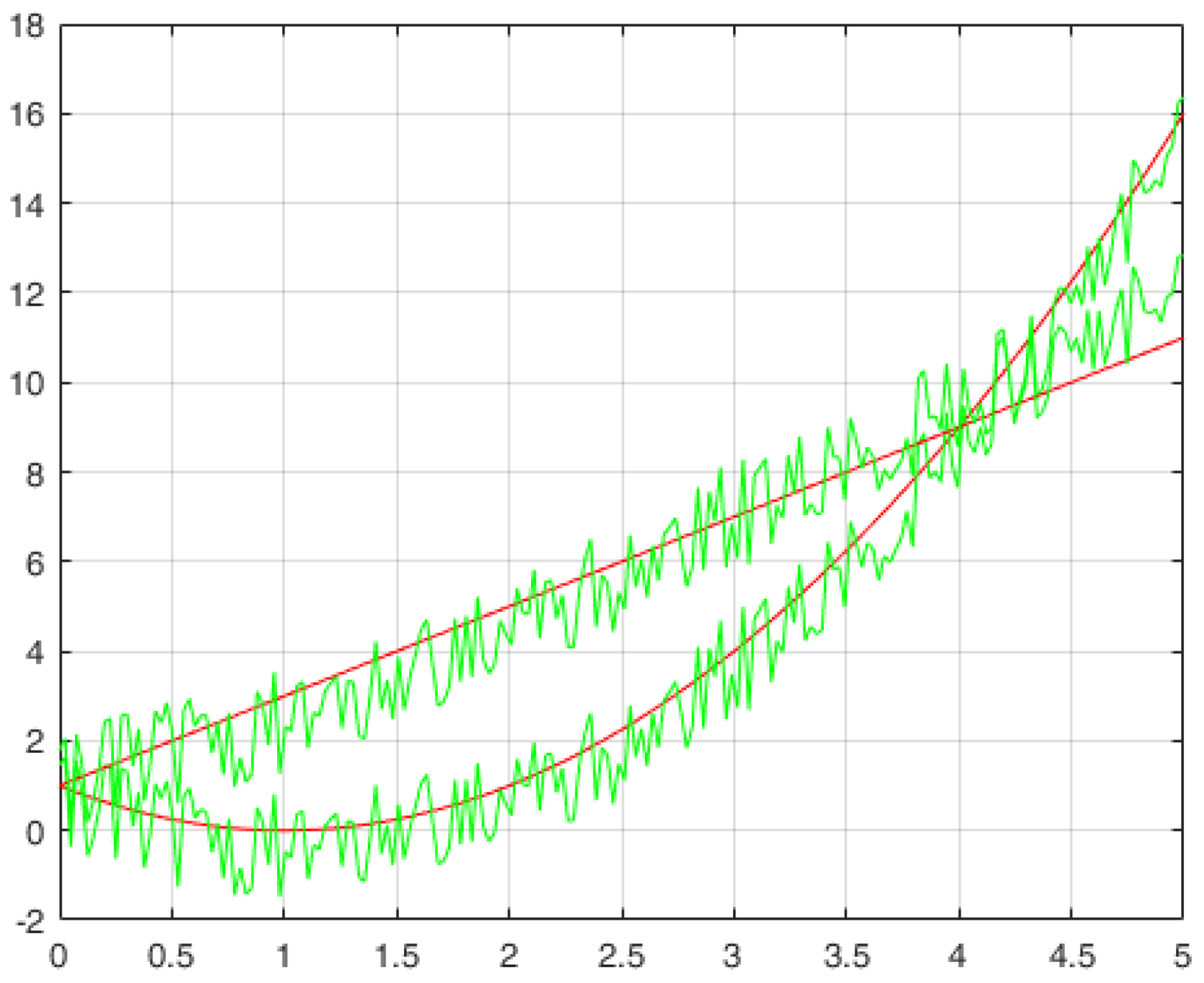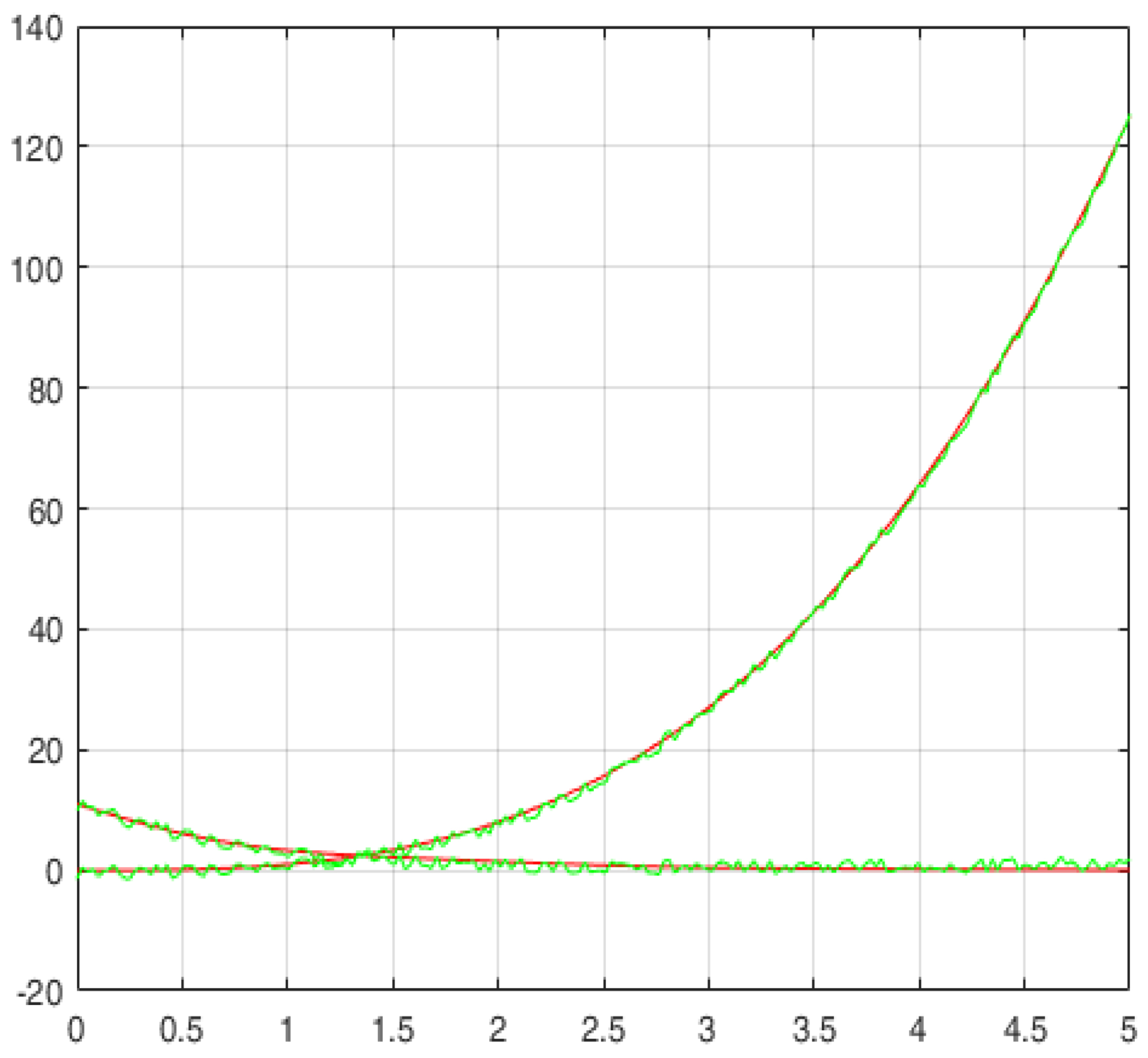 Результат восстановления искомых функций представлен на рисунке 2. Зеленым обозначены найденные функции, красным – эталонные.
