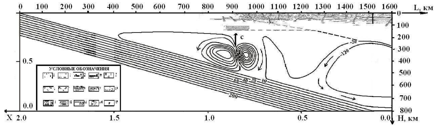 Из рисунка 1 видно, что в расчетной модели субдукционной зоны (нижняя часть рисунка) с погружением Черноморской литосферной плиты под Русскую был правильно рассчитан угол наклона этой плиты (27о), который соответствует наклону верхней кромки этой литосферной плиты, фиксируемому на реальном геолого-геофизическом разрезе (верхняя часть рисунка). Кроме того, из рис. 1 видно, что точно рассчитано местоположение конвективной вихревой структуры квазистационарного распределения безразмерной функции тока, связанной с формированием восходящего конвективного потока (вертикальная стрелка – с). Над этой конвективной зоной, в верхней части рисунка, на реальном геолого-геофизическом разрезе наблюдается зона плавления горных пород мантии, которую мы ассоциируем с восходящим мантийным термическим диапиром.