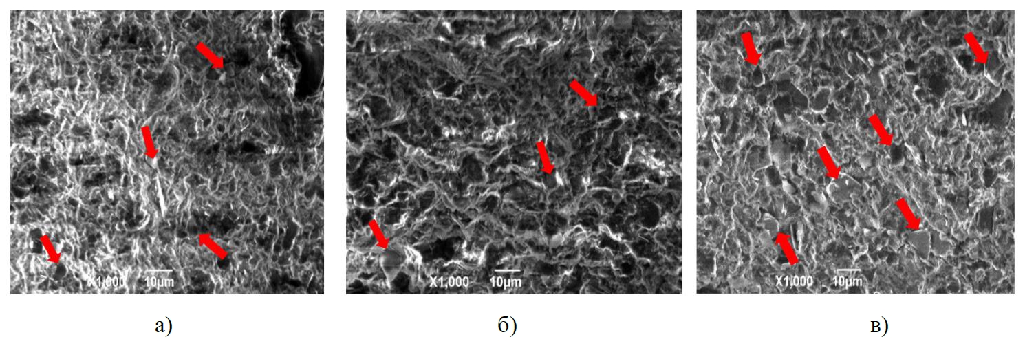 Методом сканирующей электронной микроскопии получены микрофотографии холодного скола поверхности исследуемых полимерных композиционных материалов, представленные на рисунке 1.
