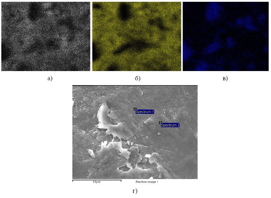 Ниже на рисунке 2 представлены карты распределения химических элементов по площади образцов, количественный анализ содержания элементов представлен в таблице 1.