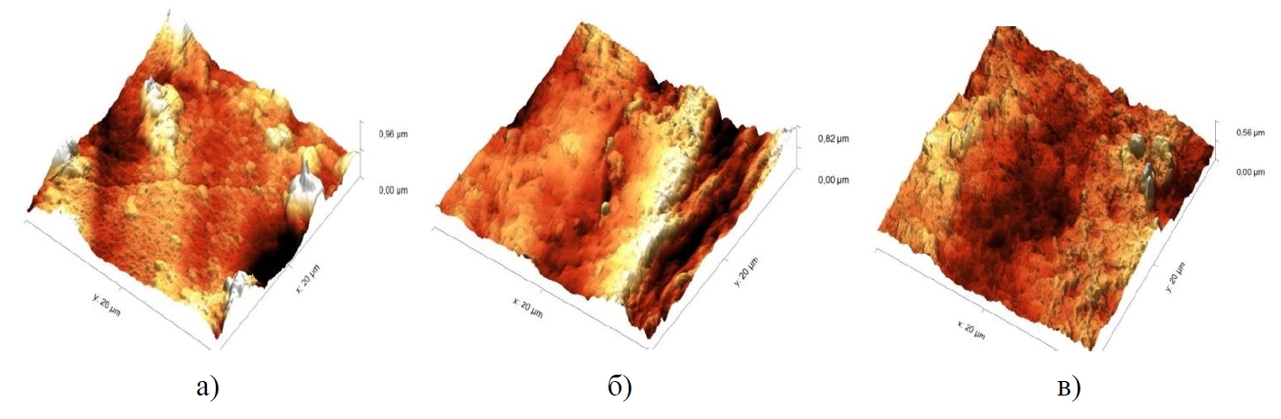 С применением метода атомно-силовой микроскопии исследованы поверхности трения образцов после проведенных триботехнических испытаний (рис. 3). Предположительно, близкое расположение частиц наполнителя в полимерной матрице привело к формированию множества локальных контактов макромолекул и обволакиванию матричным материалом твердых частиц гексагонального нитрида бора, что свидетельствует об усилении взаимодействия частиц наполнителя с матрицей (рис. 3а,б), высота выступов материала составляла до 0,96 мкм. Рельеф поверхности образца спрессованного с помощью технологического режима УЗ+100 (рис. 3в) характеризуется снижением высоты выступов до 0,56 мкм и их равномерным распределением по всей исследуемой области.