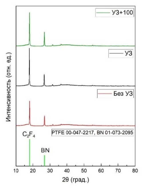 Применение технологического режима УЗ+100 при прессовании ПКМ на основе ПТФЭ, модифицированного гексагональным нитридом бора масс. 5 %, приводит к формированию более однородной и равномерной структуры, а также влияет на усиление межмолекулярного взаимодействия.