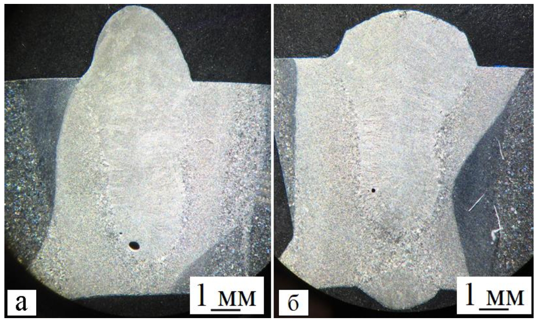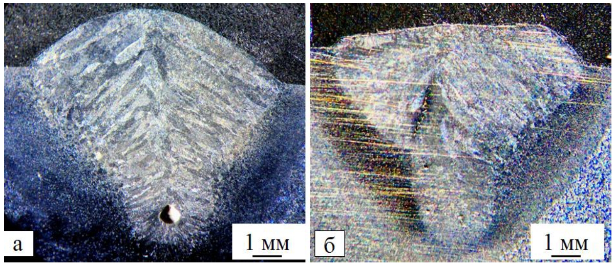 Рисунок 3 – Микрофотографии поперечного сечения наплавленного металла: а – наплавленный металл без ультразвуковой обработки, б – наплавленный металл с ультразвуковой обработкой