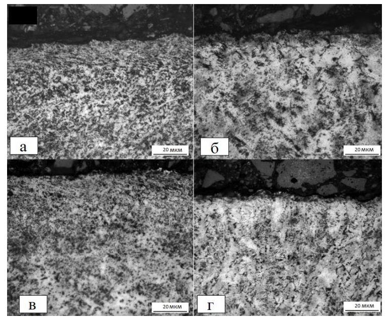 Рисунок 5 – Микроструктура наплавленного металла образцов: а, б – с ультразвуковой обработкой; в, г – без ультразвуковой обработки