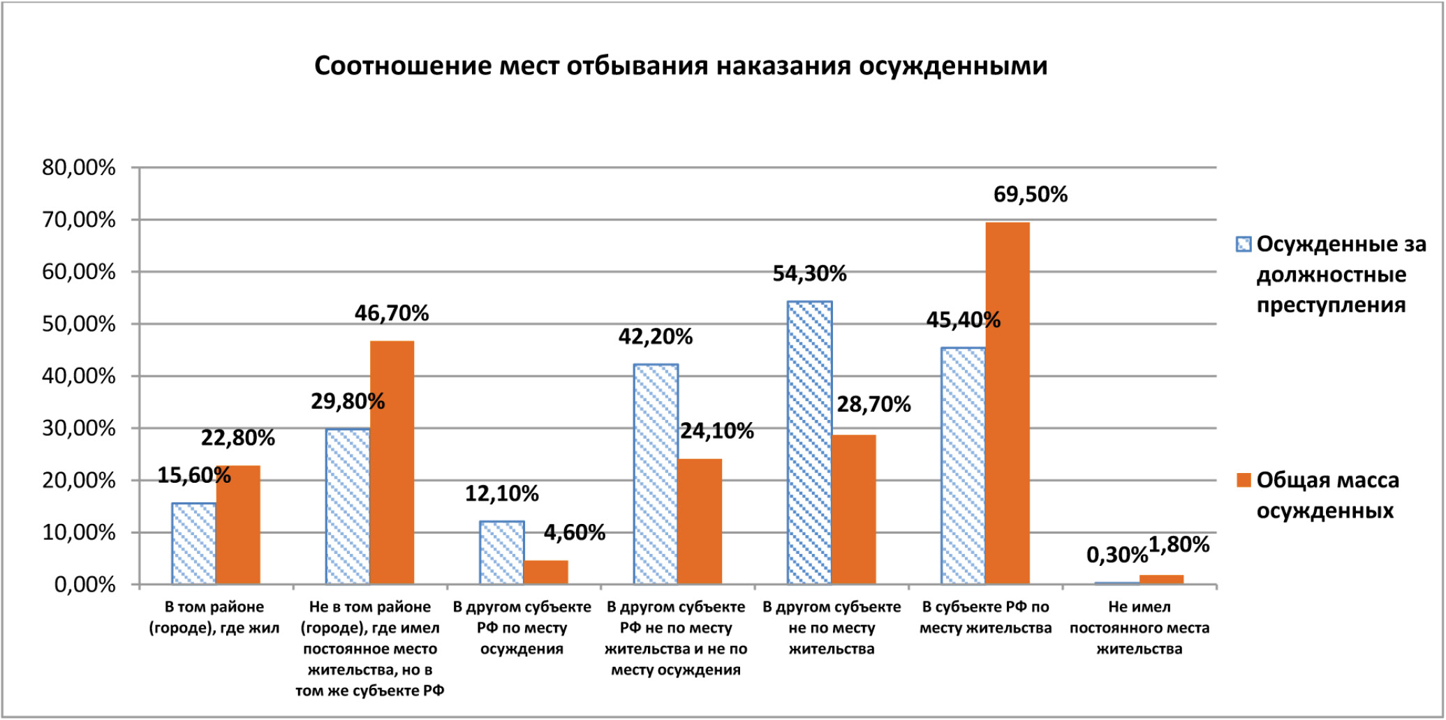 Учитывая то обстоятельство, что большинство должностных преступников осуждается к длительным срокам лишения свободы («отбывают срок до 10 лет лишения свободы» [3, с. 124]), количество отбывающих лишение свободы в субъектах, в которых не проживало, должно быть снижено до минимума.