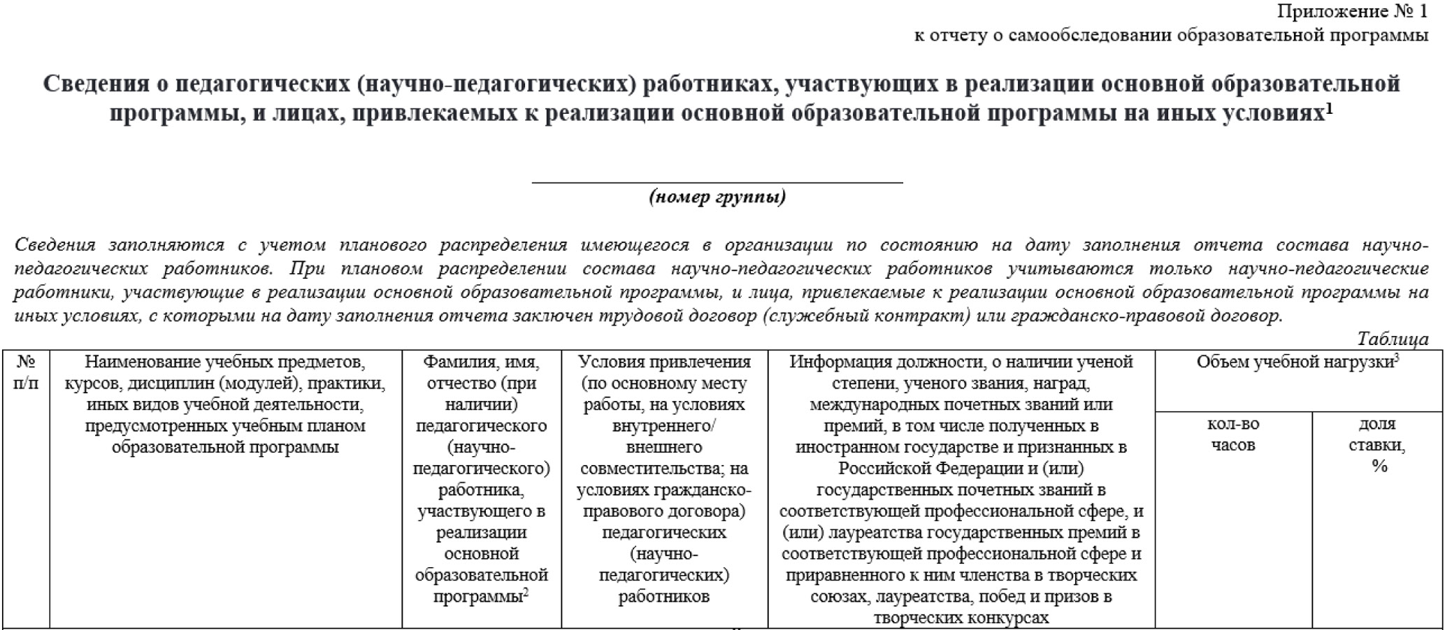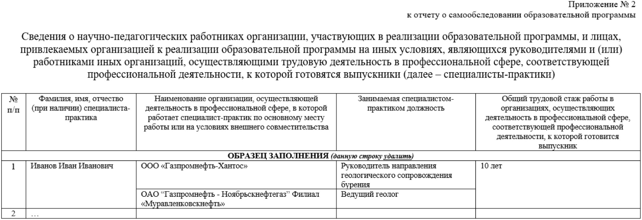 Для оценки кадрового обеспечения по образовательной программе руководители образовательных программ ежегодно формируют кадровую справку по утверждаемому макету. Данная форма отчетности ежегодно формируется по всем образовательным программам ЮГУ (бакалавриат, специалитет, магистратура) по выпускным курсам. На рисунке 1 представлен макет кадровой справки по педагогическим работникам организации, участвующим в реализации основной образовательной программы, на рисунке 2 – макет кадровой справки по специалистам-практикам, привлеченным в качестве педагогических работников.