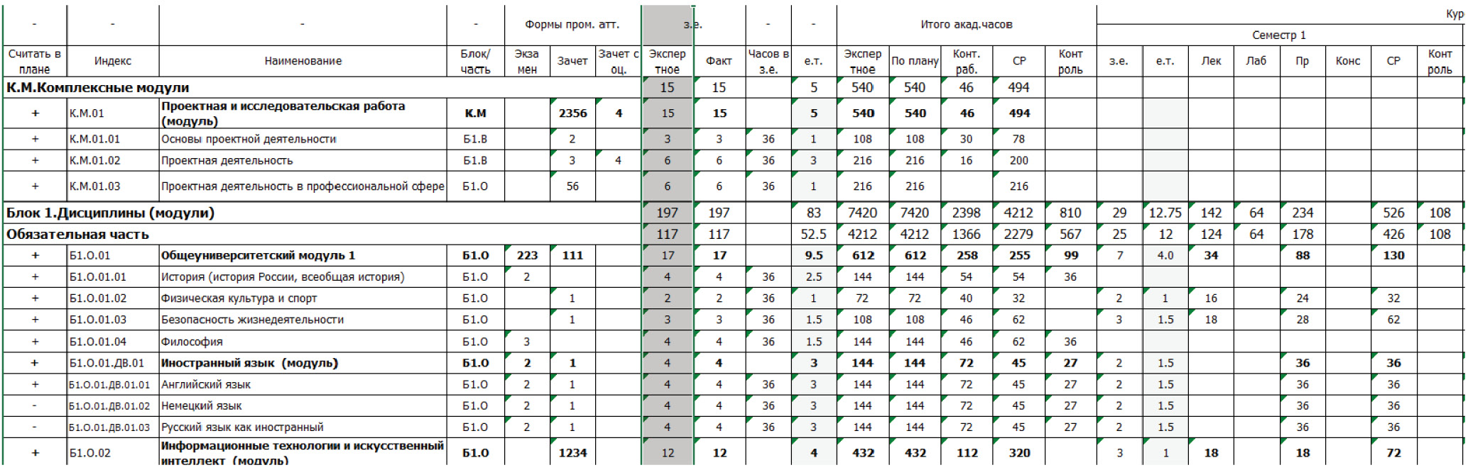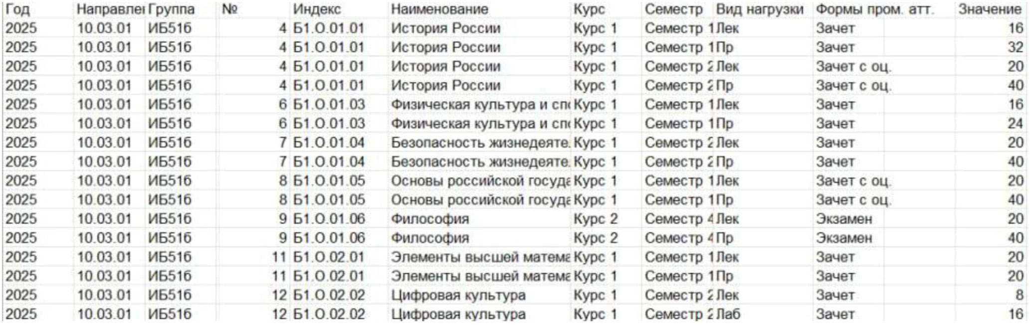 Первой задачей является преобразование учебных планов, выгружаемых из АИС «Учебные планы» (рисунок 4), в плоский вид. На рисунке 5 представлен фрагмент учебного плана после выгрузки из АИС «Учебные планы» в формате xls.