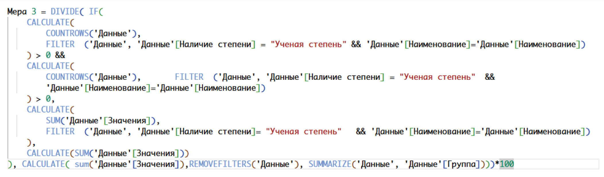 Моделирование данных в Visiology выполнено на языке программирования DAX. На рисунке 9 представлен пример использования DAX для расчета доли преподавательского состава, имеющего ученую степень, в общем объеме учебной нагрузки по образовательной программе.