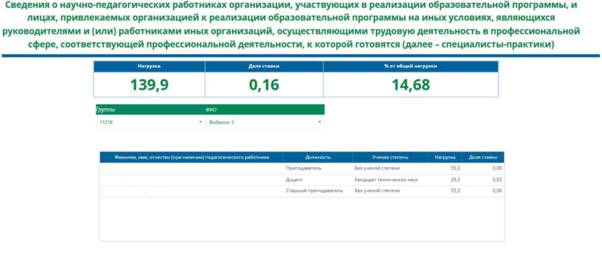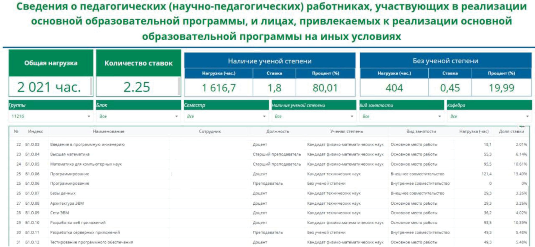 Он позволяет руководителю образовательной программы при помощи срезов/фильтров получить список преподавателей, совмещающих основную учебную деятельность с работой в сторонних организациях, связанных с профессиональной сферой подготовки выпускников, а также информацию о доле учебной нагрузки таких преподавателей в общем объеме учебных занятий.