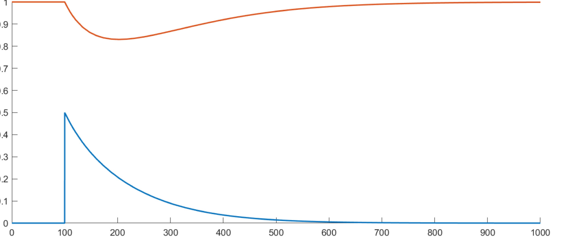 Рисунок 1. Распределение уровня кислорода и загрязнения при x0 = 100, q = 0,5, a = 0,01, Y = 1, k = 0,01