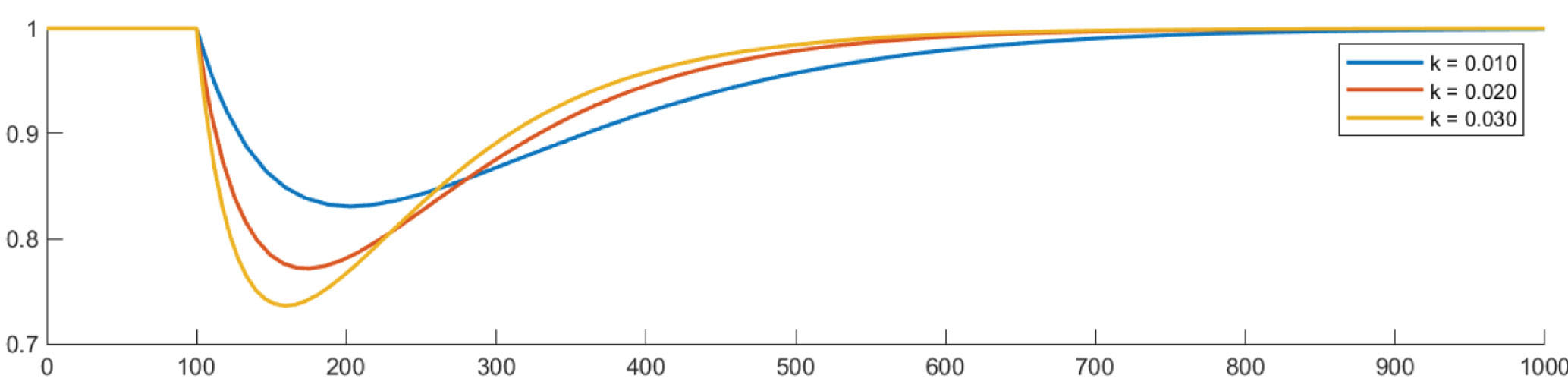 Рисунок 3. Распределение уровня кислорода при k = 0,01, k = 0,02 и k = 0,03