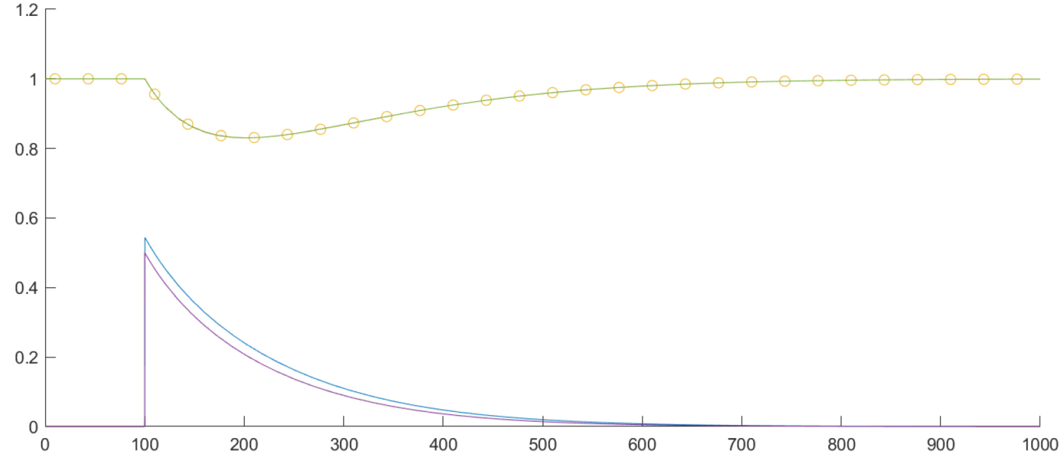 Верхний график показывает уровень кислорода. Как и ожидалось, он снижается в процессе окисления загрязняющего вещества, а затем восстанавливается после уменьшения уровня загрязнения.