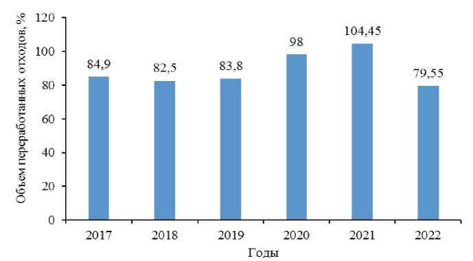 В 2022 году процент переработки отходов составил 79,55 % (2021 г. – 104,45 %) (рис. 1). Достигнутый объем переработки отходов в 2021 г. (более 100 %) объясняется тем, что кроме отходов, образованных в текущем году, дополнительно переработаны остатки отходов на предприятиях 2020 г.