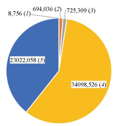 Рис. 3. Общее количество образовавшихся отходов животноводства (1), птицеводства (2), сахарного (3), спиртового (4 и 5) производств