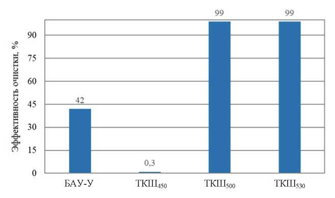 Из полученных данных, представленных на рис. 1, очевидно, что максимальная эффективность извлечения фенола из модельного раствора (99 %) достигается при использовании сорбционных материалов ТКШ500 и ТКШ530. Учитывая энергозатраты на получение сорбционного материала, установлено, что оптимальной температурой обработки ОКШ является 500 °C.